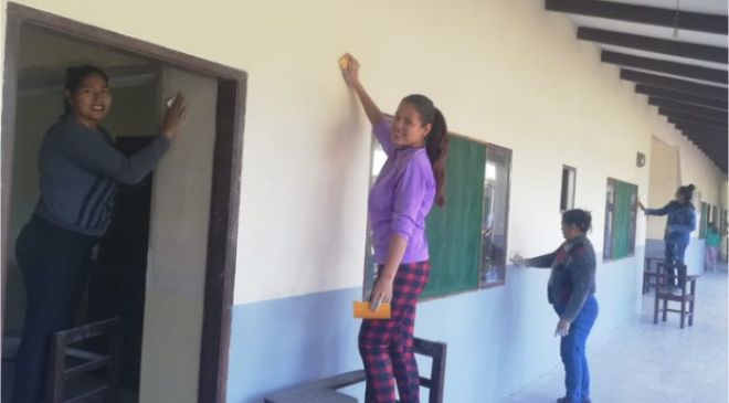 Una vez finalizadas las labores de refacción, Itacamba organizó una minga junto a los profesores, padres de familia y alumnos de secundaria, para limpiar y pintar el establecimiento.