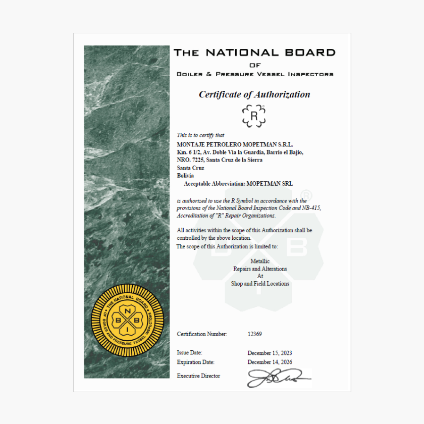Mopetman SRL, firme a su misión y visión, buscando liderar el mercado boliviano del sector petrolero, energético e industrial, ha logrado dos nuevas certificaciones de reconocimiento y prestigio internacional, implementando un Sistema de Control de Calidad para cumplir con los requisitos del Código (ASME) de Calderas y Recipientes a Presión y el Código de Inspección de la Junta Nacional (NB), logrando las siguientes certificaciones: