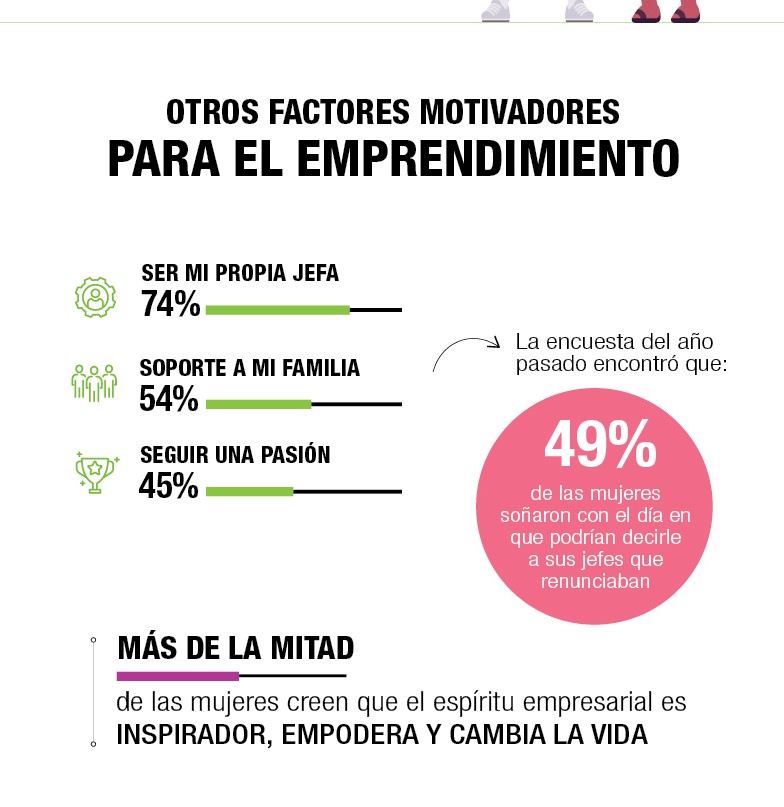 En nuestro país, convertirse en un modelo a seguir para las mujeres más jóvenes resultó ser un factor motivador para el 82% de las encuestadas, mientras que al 59% le gustaría iniciar un negocio debido a un trato injusto en roles laborales anteriores.