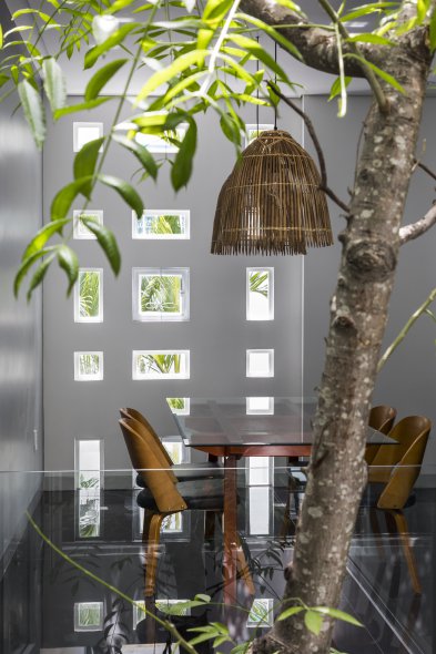 Así, la casa emplea una serie de muros con aberturas, a la manera de celosías, para dejar entrar el aire y la luz, pero esta última no en exceso para crear un atmósfera íntima y alejada del bullicio de afuera.