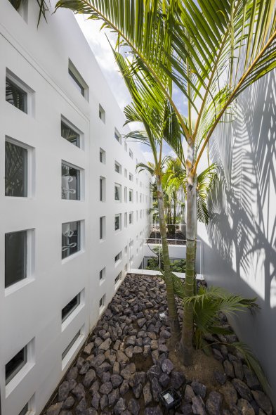 La única fachada es una sucesión de planos que crean una textura urbana que rompe con la uniformidad de las construcciones vecinas. Este remetimiento de planos crea sombras, patios y terrazas con una profusa vegetación.