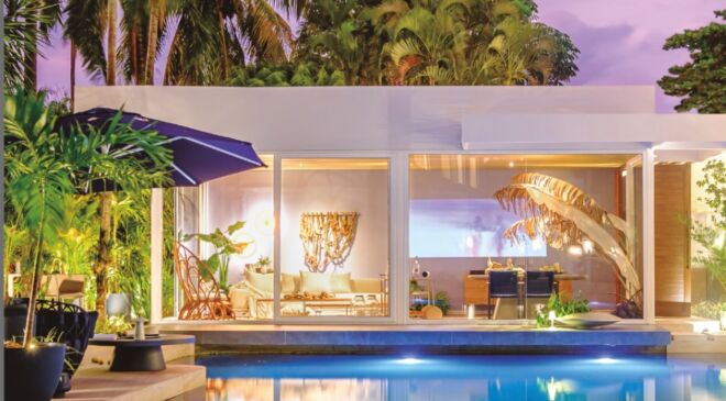 Se lo puede describir como una caja de cristal por tener paredes y puerta de blindex, en el que apenas se perciben los perfiles. “Quise generar un interiorismo que conecte, de manera natural y fluida, con el espacio exterior”, dice la profesional. “Mantuve la piscina en su forma original y la rodeamos con un deck de madera y sobrones de cerámica”. La idea permite que, de ambos lados, el visitante tenga vistas privilegiadas. Oshiro se enfocó también en promover la arquitectura sostenible, utilizando sobras de materiales y reutilizando el agua en la piscina.