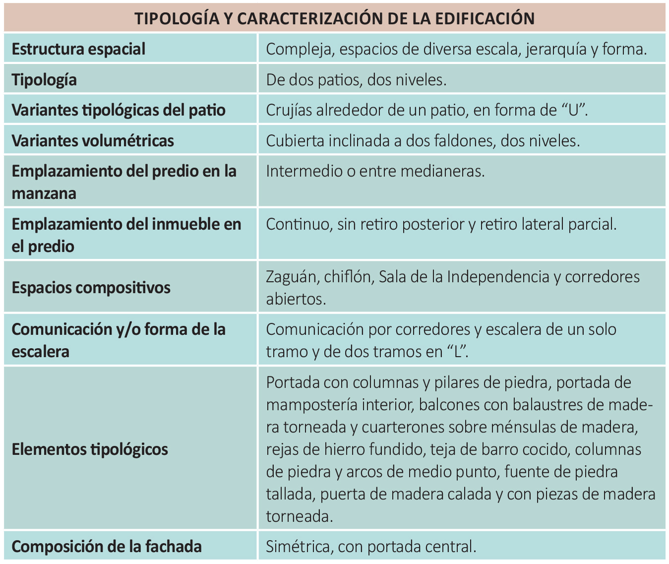 Edificio con un patio principal y otro secundario residual. El primer patio presenta tres crujías en forma de “U”. A la planta baja se accede a través de un zaguán que comunica con cuatro corredores alrededor del espacio principal; en la parte central de la crujía de fondo está dispuesta perpendicularmente la Sala de la Independencia, antigua capilla de la Universidad y posterior sede de la Asamblea Constituyente.