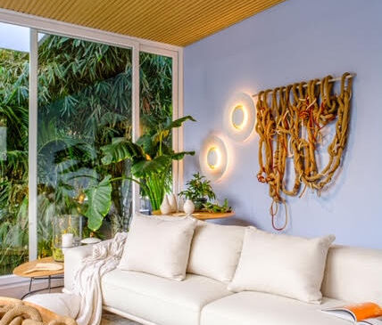 El proyecto logra síntesis generando un prisma de vidrio con transparencias y visuales a 180 grados, teniendo el cielo raso y una pared como únicos planos contenedores. Sobre la pared apoya mobiliario de diseño y ha elegido la arquitecta intervenirla con DECORA SEDA en el color del año 2022 de Coral, Melodía Suave. Un azul claro, versátil, que genera en la propuesta un clima aireado, fresco, abierto e inclusivo para el alma que se potencia con el color de la piscina que parecen amalgamarse dando continuidad. Estar allí nos proporcionan sensaciones de liviandad trayéndonos al interior más naturaleza y aportando sutilmente más luz durante el día.