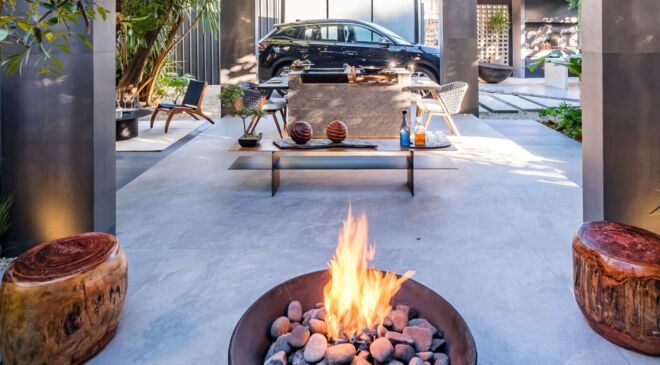 Para intervenirlo, el arquitecto utilizó materiales como el porcelanato en tonos azules para dar la sensación de tranquilidad, ademas de la fogata, piedras y tejidos que se reflejan en el mobiliario para exterior.