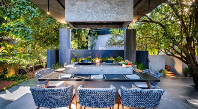 Una plancha de teppanyaki – churrasquera, hacen que la isla central interactúe con los invitados, además de un espacio al aire libre con contacto directo a la vegetación existente en el lugar.