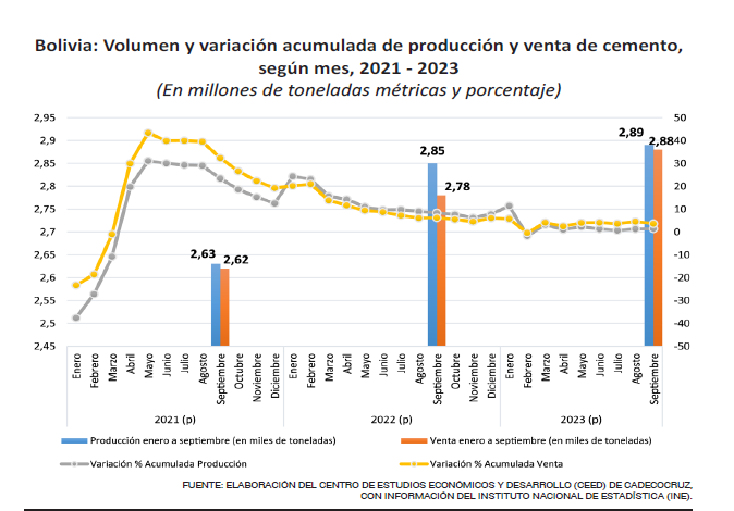 De acuerdo con datos del INE, durante septiembre de 2023 la producción de cemento alcanzó a 2,89 millones de toneladas métricas (TM), 1,4% superior en comparación al mismo período de la gestión anterior, la cual llegó a 2,85 millones de TM.