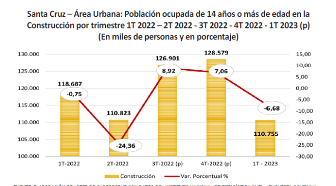 En Santa Cruz el sector constructor sustentó 110.755 fuentes de trabajo el primer trimestre de este año, mostrando un descenso del 6,68% respecto al primer trimestre del 2022.