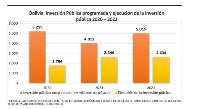 La reducción de la inversión pública ralentiza el crecimiento económico de los diferentes sectores de la economía. En la gestión 2022 el monto aprobado en el Presupuesto General del Estado fue de 5.015 millones de dólares para inversión pública, de los cuales 29,9% estaban destinados a Infraestructura.