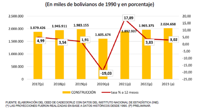 De acuerdo a los análisis y proyecciones del Centro de Estudios Económicos y Desarrollo de Cadecocruz, el PIB de la construcción en Bolivia bordeará el 3% este año, previsión que puede tener tendencia a la baja considerando los acontecimientos económicos, políticos y financieros del país.