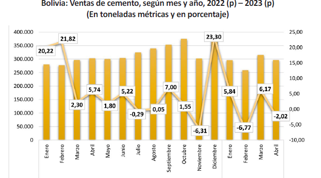 Las ventas de cemento en el país muestran un comportamiento coincidente con la producción. En abril del 2023 se registró una caída de 2,02%, con un total de 297 mil toneladas (TM) de cemento vendidas, mientras que en abril de 2022 la cifra superaba las 303 mil TM.