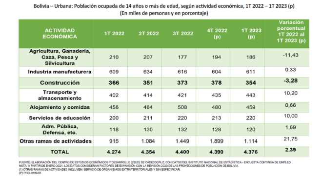 En marzo de 2023, según datos de la Encuesta Continua de Empleo, la población ocupada en el área urbana que realiza actividades inherentes al rubro de la construcción, alcanzó 360 mil personas, cifra superior a las 341 mil registradas en marzo de la gestión anterior, indicando un crecimiento del 5,57%.