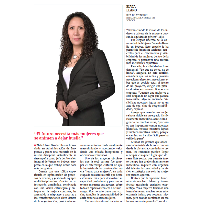 Elvia Llano, jefa de Atención Integral de Ventas en Soboce, valora que la presencia femenina ha crecido, tanto en cargos operativos como en espacios de liderazgo, por lo que hoy existen más mujeres ingenieras, arquitectas, técnicas, supervisoras y obreras. Aunque aún queda mucho por avanzar, ve con esperanza cómo se van construyendo redes, políticas y espacios que antes eran impensables. “Las empresas empiezan a hablar de inclusión, de equidad, y las mujeres nos estamos haciendo visibles. Lo que antes era excepcional, hoy empieza a ser posible”.