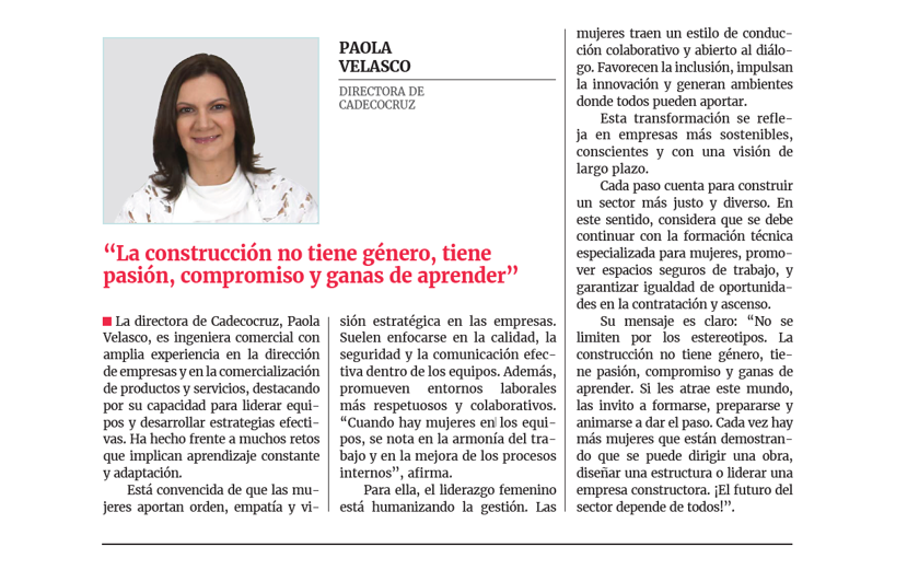 La directora de Cadecocruz considera que el principal motor de la participación femenina en el sector es la formación y la capacitación, ya que desde instituciones como Cadecocruz y su Fundación Construyendo impulsan programas que promueven el desarrollo de talento femenino y reducen brechas laborales.