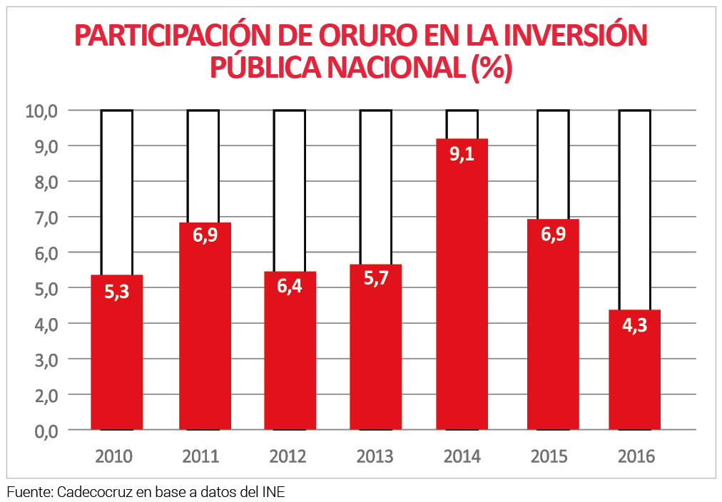 En cifras absolutas, la inversión pública en Oruro muestra un crecimiento sostenido importante, aunque con importantes fluctuaciones, al pasar de $us 81 millones ejecutados el año 2010 a $us 218 millones ejecutados el 2016, aunque el mejor año fue el 2014 con una ejecución de $us 408 millones.