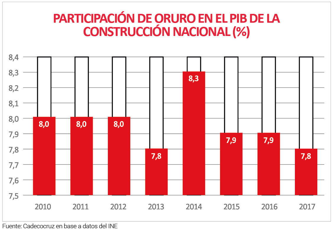 Este comportamiento de la actividad de la construcción, con crecimiento a tasas inferiores a las nacionales, ha provocado que la participación de Oruro en el PIB de la construcción del país se haya mantenido en un promedio del 8% desde el año 2010, habiendo alcanzado su mayor participación el 2014 con el 8,3%. Mientras el 2017 Oruro representaba el 7,8% de la actividad de la construcción a nivel nacional.