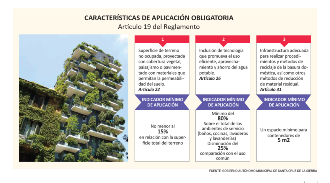 Según la Norma del Código de Urbanismo y Obras de Santa Cruz, para ser aprobados como ecosostenibles los proyectos deberán tener las siguientes características o cumplir, como mínimo, con seis de los puntos siguientes, siendo los tres primeros de carácter obligatorio: