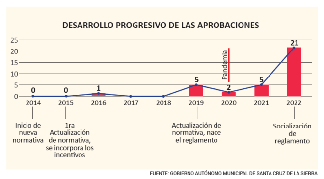 Entre los años 2021 y 2022 se da un alza notoria en la aprobación de edificios ecosostenibles en la capital cruceña, de 5 a 21 proyectos, de acuerdo con un relevamiento de datos realizado por Blanca Alicia Rojas, directora de Regulación Urbana del Gobierno Municipal de Santa Cruz de la Sierra y su equipo de trabajo.