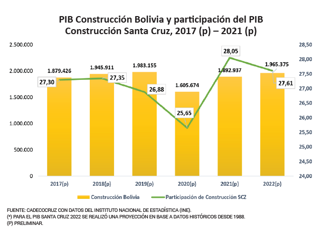 La actividad de la construcción en el departamento de Santa Cruz, el 2022, representó el 27,61% del PIB nacional, indicador que ratifica el liderazgo regional en el sector. Este dato se basa en información preliminar del INE y el análisis del Centro de Estudios Económicos y Desarrollo (CEED) de la Cámara de la Construcción de Santa Cruz (Cadecocruz).