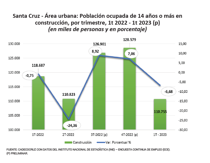 De acuerdo con el análisis de Cadecocruz e información proporcionada por el INE, el sector construcción en el área urbana de Santa Cruz emplea más de 90 mil personas cada trimestre, al primer trimestre de 2023, se registra un total de 110.755 personas ocupadas en el sector, representando cerca del 8% de participación en el mercado laboral.