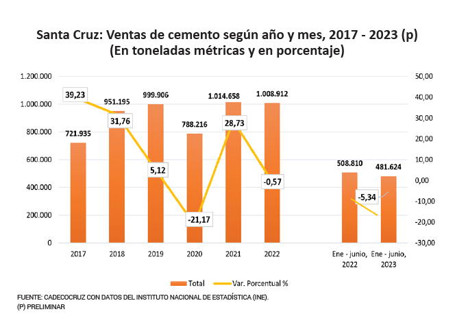 En 2017, las ventas de cemento presentaron un crecimiento del 39,23% mientras que, en 2019 sólo crecieron en 5,12%. La gestión 2020 registró una caída del 21,17%; la recuperación se produjo en 2021 con un indicador positivo de 28,73%. El 2022 se observa nuevamente una caída del 0,57%. Los reportes periódicos del CEED de Cadecocruz, muestran que de enero a junio del 2023 se registró un decrecimiento de 5,34%, en comparación con 2022.