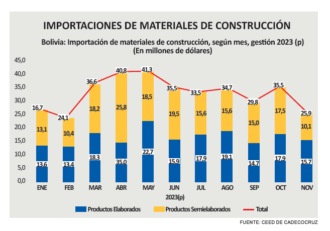 Un comunicado de la Sociedad de Ingenieros de Bolivia Departamental Santa Cruz (SIB-SC) señala que el alza de precios en los insumos utilizados en la construcción genera una variación importante en el presupuesto inicial de las obras, que se ven afectadas con el impacto de estos incrementos, generando una desestabilidad que repercute directamente sobre todos los que intervienen en el sector, creando desempleo y agudizando la crisis económica.
