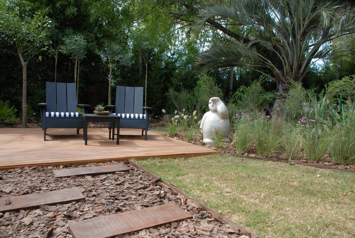 En el área de descanso se armó un living con muebles en lapacho viejo, que aporta calidez. Está rodeado por un bosquecito de alocasias, que suma un toque salvaje. Varias macetas con distintos formatos y esmaltadas en color visón, con alocasias negras, Strelitzia Reginae y Kalanchoe Thyrsiflora terminan de completar el diseño del espacio.
