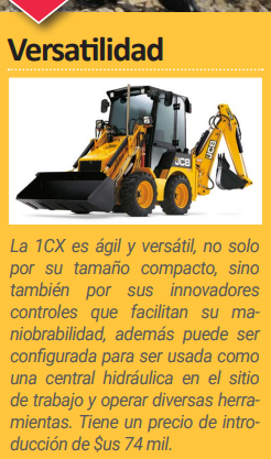 La empresa JCB Gerona realizó el relanzamiento oficial de la JCB 1CX, la retroexcavadora más pequeña del mercado. “Dimensiones como 1.58 metros de ancho, 3.4 metros de longitud en su posición de traslado y altura de 2.25 metros que puede incluso ser reducida a 2.1 metros si se coloca una cabina de bajo perfil, permiten que la máquina pueda trabajar en espacios que hasta ahora eran impensables”, explicó Cesar Garban, product manager Latam.