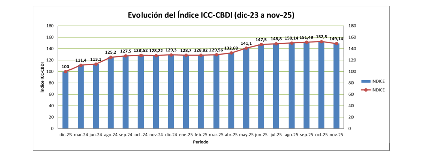 La Cámara Boliviana de Desarrolladores Inmobiliarios (CBDI) informa la actualización del Índice de Costos de Construcción de Vivienda (ICC-CBDI) correspondiente al mes de noviembre de 2025, herramienta técnica de referencia para el análisis, proyección y toma de decisiones en el mercado inmobiliario formal de Bolivia.